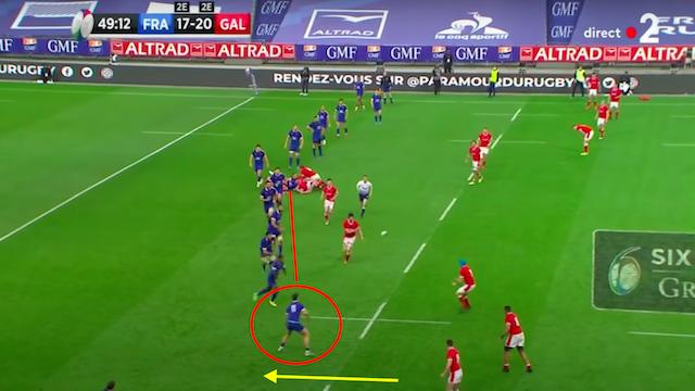Cette action qui paraît anodine est en fait la seule où la rush défense à proprement parler nous coûta des points la semaine dernière. Ici, l'on voit que le premier rideau tricolore est parfaitement aligné (ligne rouge) dans un premier temps, tandis que Damian Penaud (encerclé), en tant que dernier défenseur, doit "verrouiller" l'extérieur en montant un poil plus vite que ses partenaires.