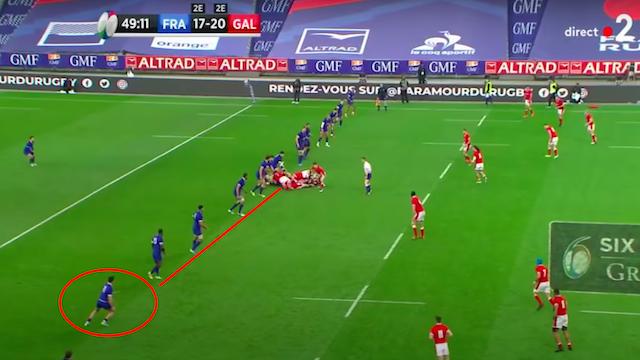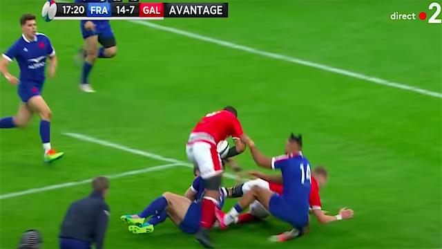Ici, c'est plutôt la défense individuelle de Teddy Thomas qui peut être ciblée. S'il est probablement meilleur que Penaud collectivement, il est aussi souvent plus "léger" que lui dans le 1 contre 1 sans ballon. Sur cette action par exemple, le Racingman est renversé par Faletau dans une zone critique et l'équipe de France ne doit finalement son salut qu'au fait que le numéro 8 gallois s'embronche sur Antoine Dupont qui passait par là... Face à l'Ecosse et son numéro 11 surpuissant et ultra-athlétique (Duhan Van der Merwe), le staff tricolore a donc choisi la "sûreté" et le gabarit de Damian Penaud plutôt que T.T. Ça se tient...