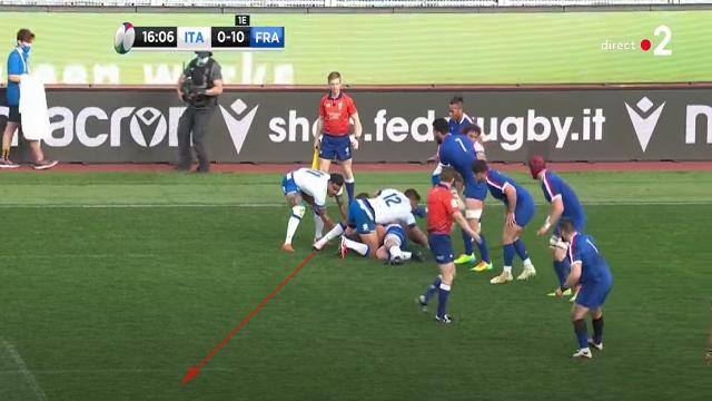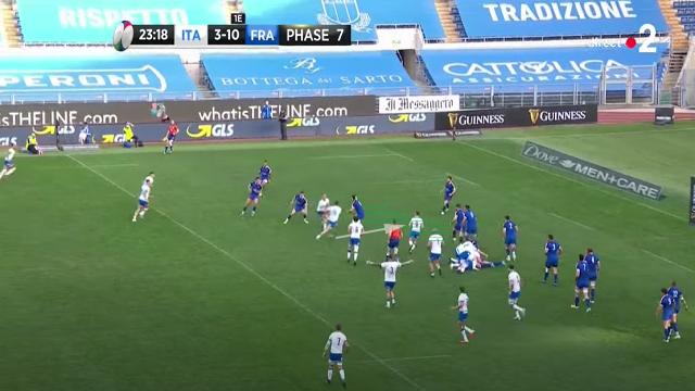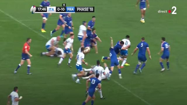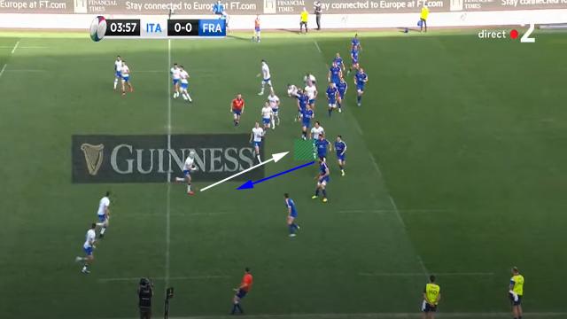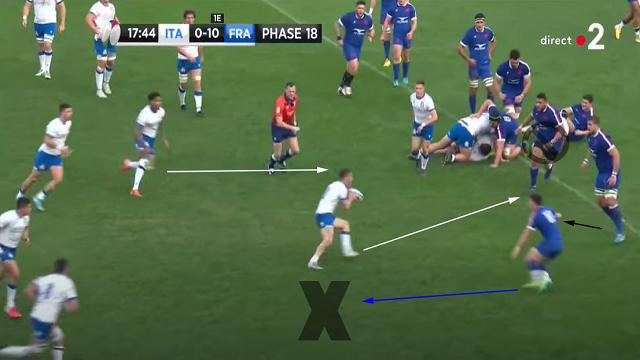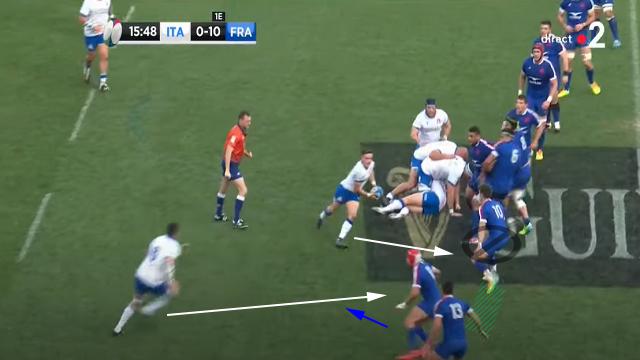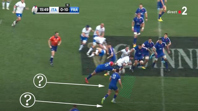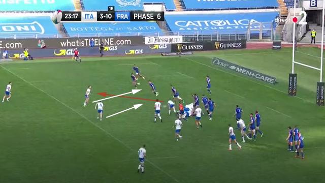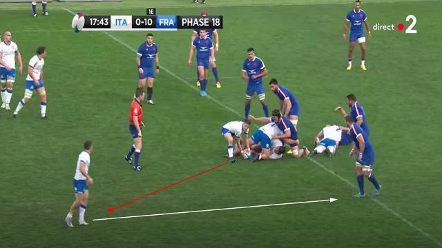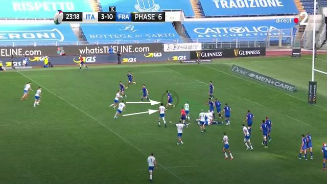 Antoine Dupont se replace, mais le déséquilibre est déjà présent. Les Italiens obligent les Français à se resserrer. On peut encore une fois voir l'attitude de Mohamed Haouas qui est le seul Français à venir couvrir le dos de ses partenaires placés sur la largeur. Plusieurs fois dans le match, il deviendra second plaqueur ou même, comblera les trous crées.