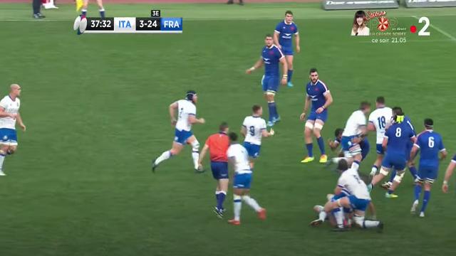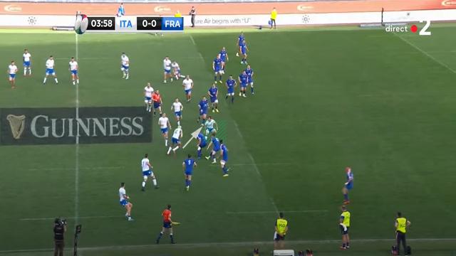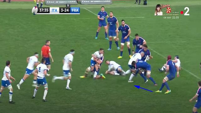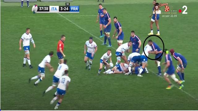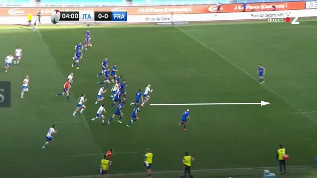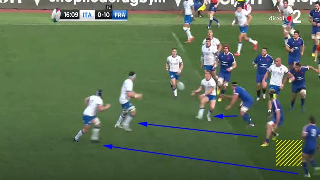 Cette action aurait pu aboutir à un essai si le numéro 8 italien n'avait pas coupé la passe de son 9 pour Garbisi. Le ballon était encore sorti rapidement vu que les Bleus n'ont jamais mis les mains sur les rucks. N'oublions pas que pour que la défense (et surtout une défense comme celle des Bleus), puisse avoir le temps de se replacer, il faut mettre les mains sur les rucks et ralentir les sorties de balles. Les joueurs ont plus de chemin à parcourir en pas-chassés afin de se placer épaule extérieure de leur vis-à-vis.