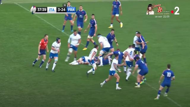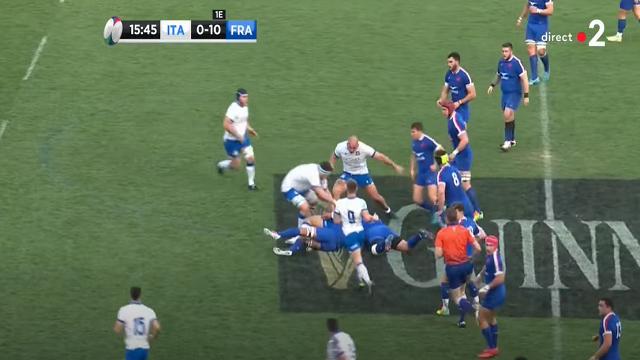 Le grand point faible des Bleus ce samedi a été le manque de constance au ras des rucks. On le voit dès la 15e minute avec cette séquence italienne bien animée par Varney, le demi de mêlée. Derrière un plaquage offensif, ce dernier va aller chercher le ras du ruck alors qu'une fois de plus, les Français s'entremêlent les pinceaux, et ne se redistribuent pas bien. Ici, il s'agit de Cretin avec Alldritt.