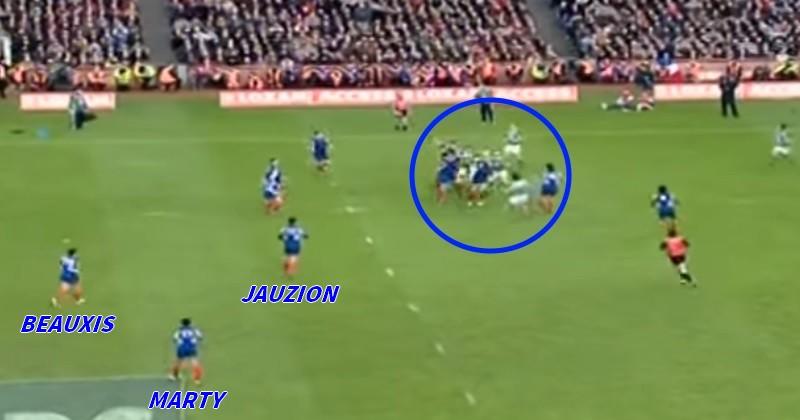 Marty (dans le rond bleu) peut faire le crochet intérieur sur Shane Horgan (titularisé ce jour-là à la place de Brian O'Driscoll, absent) mais il choisit l'extérieur. Le choix est le bon : le Catalan gagne son duel et prend la ligne d'avantage, mettant les Bleus dans l'avancée.