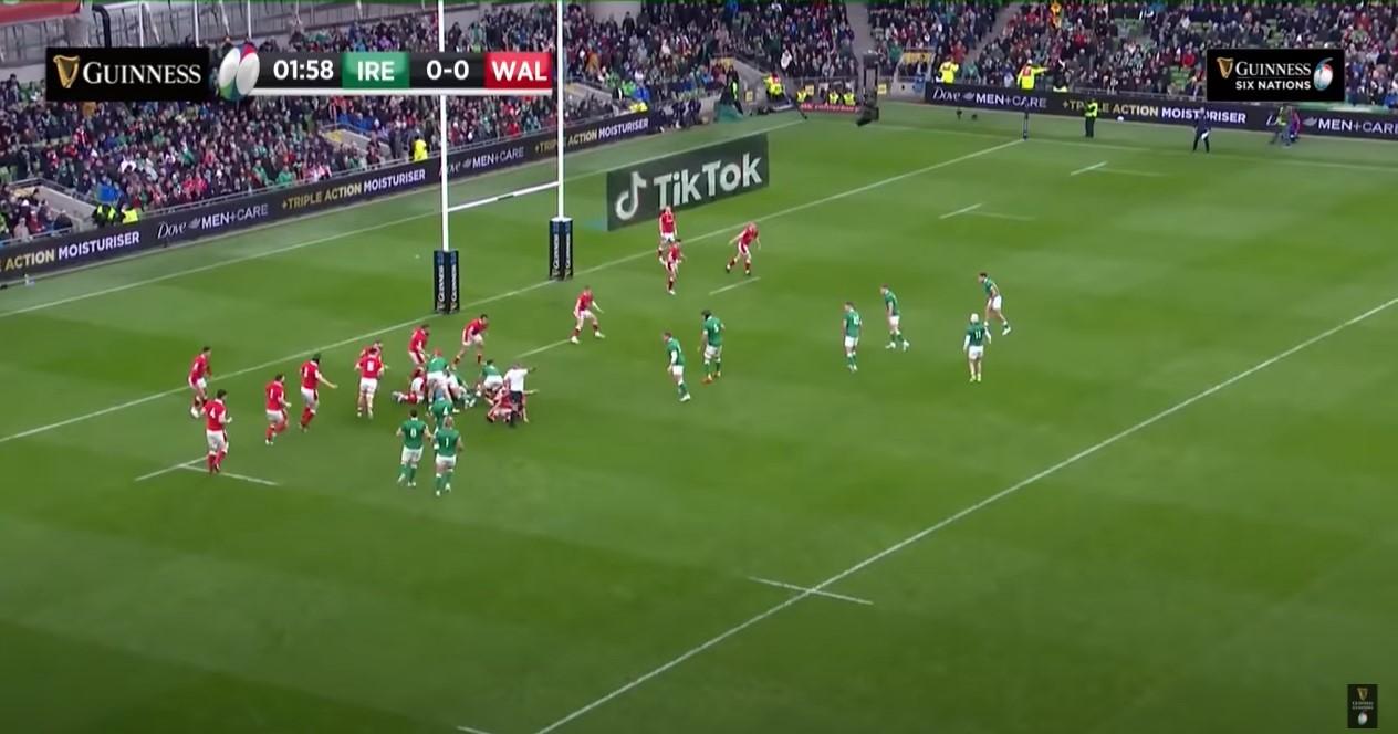 Gibson-Park accélère le jeu, Kelleher fait un premier point de fixation dans l'axe, et Conan joue en pivot pour contourner la défense inversée néo-zélandaise. En plus de posséder des joueurs de talents, les Verts alternent leurs lancements de jeu. Il n'est pas rare du tout de voir Bundee Akhi ou Garry Ringrose en premiers receveurs, voir Hugo Keenan. Ces lancements sont préparés notamment dans le cas où Sexton serait au déblayage. Le changement de fonction de ce dernier, là aussi permet de fluidifier le jeu, et de garder du dynamisme. Face au Pays de Galles, l'action du premier essai offre un aperçu de la richesse de leur attaque. Si les Irlandais répartissent leurs avant en 3-3-2 (deux premières cellules de trois avants, et une cellule de deux avants), avec Sexton, Akhi et l'ailier Hansen gravitant autour, l'exemple de leur premier essai face aux Gallois montre à quel point il est difficile de défendre dans une situation pareille.