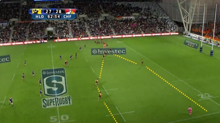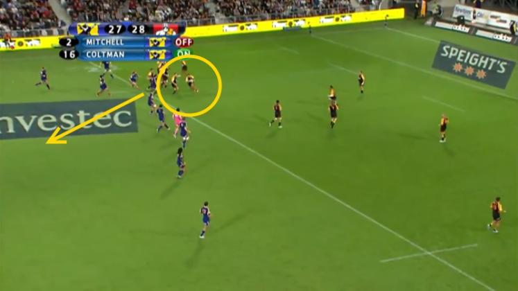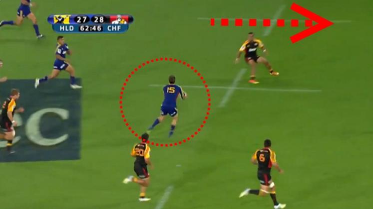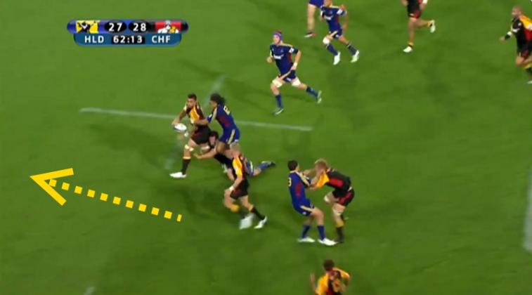 Deux temps de jeu plus loin, les Highlanders ont récupéré la balle. Comme Masaga, Ben Smith a choisi de garder le cuir et d’aller au plus simple : en ligne droite. Toujours aussi lucide, Smith (entouré en rouge) navigue dans la défense mais ne fait pas le mètre de trop et va allonger une passe vers l’extérieur pour Hosea Gear. Le futur Toulousain a un boulevard devant lui (flèche rouge).