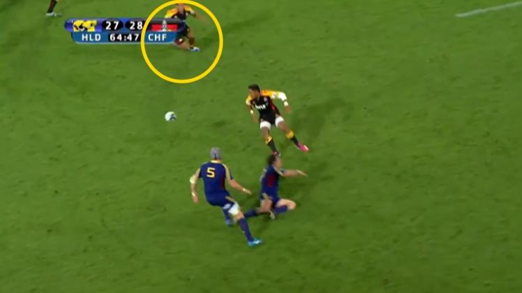 Juste derrière, les Chiefs jouent simple… et même sens. Le ballon arrive dans les mains de Messam qui ouvre l’espace à Gareth Anscombe d’une superbe passe après contact. Si la défense va finir par se refermer, on voit une nouvelle fois que les joueurs de Waikato ont réussi à franchir.